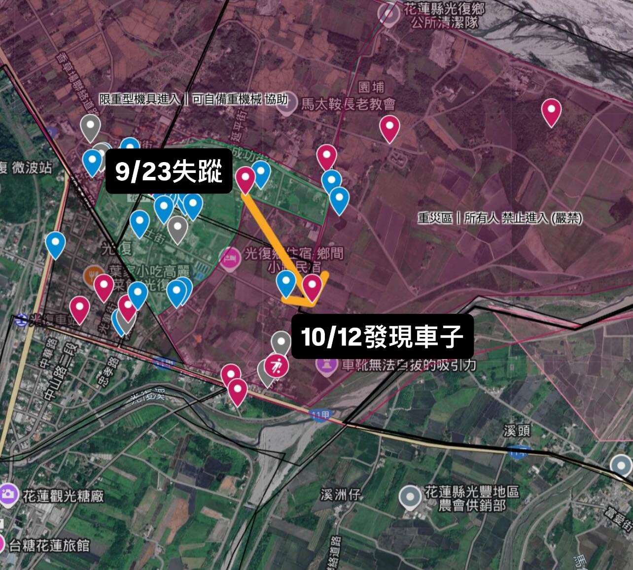 車子失蹤及被發現位置。翻攝畫面